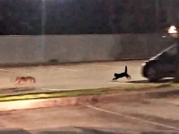 A prowling coyote proved no match for a stray black cat protecting a Port Moody parking lot Friday morning, May …