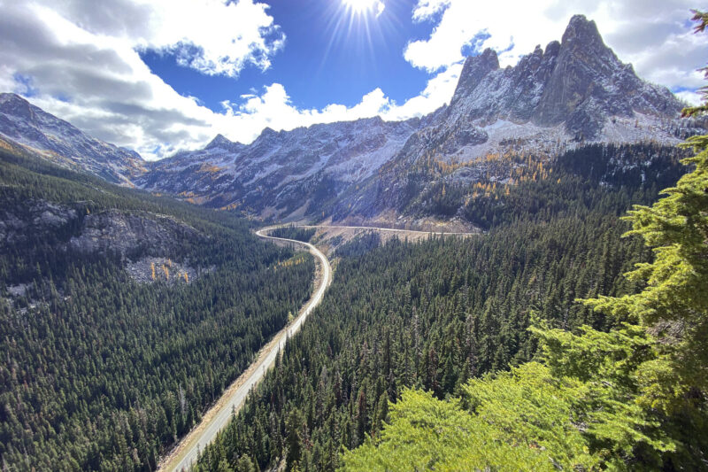 On the first leg, we connected with the North Cascades Highway near Burlington (after waiting for a train to cross). Highway 20 crosses the Cascade Mountains, following the ruts of an old wagon road carved into the cliffs in the late 1800s. Twisting and climbing through old-growth forests and mountain peaks, the route offers plenty of oohs and ahs.