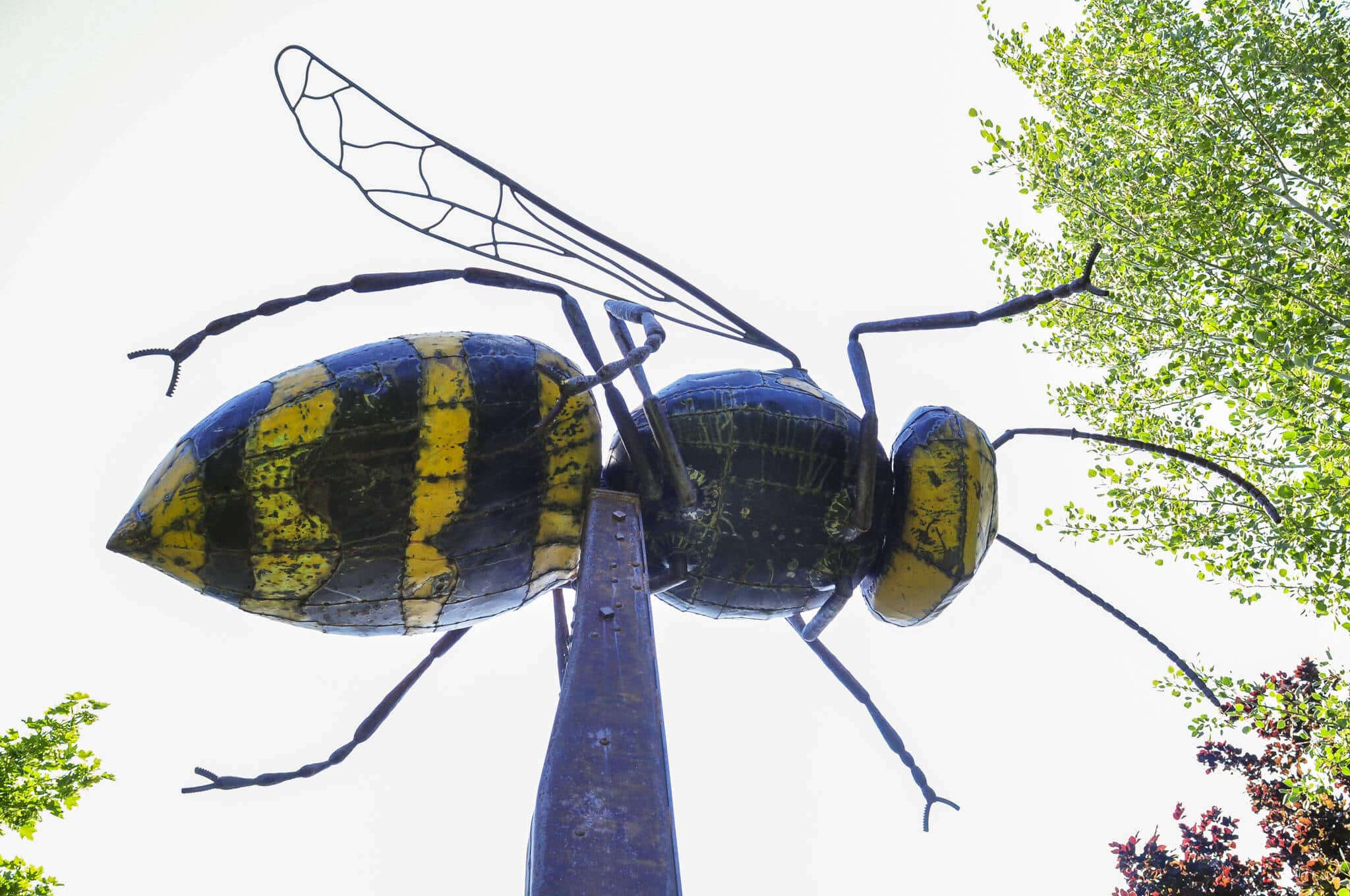 A yellow jacket sculpture titled Beeest with six-foot metal wings perches 15 feet in the air near the community center, a former school now home to the library, senior center, auditorium and a century’s worth of class photos on the walls.